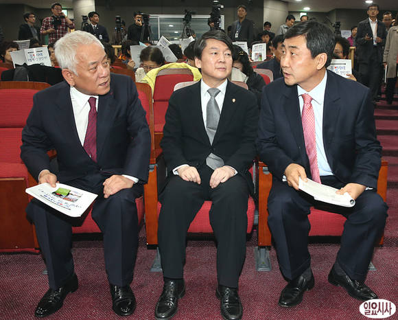 김한길 민주당 대표가 6일 오후, 국회 의원회관에서 민주당 이종걸 의원, 정의당 심상정 의원, 무소속 안철수 의원이 공동 주최한 '동양사태 어떻게 할 것인가' 정책토론회에 참석해 이야기를 나누고 있다.