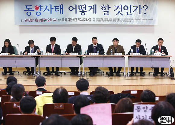 6일 오후, 국회 의원회관에서 민주당 이종걸 의원, 정의당 심상정 의원, 무소속 안철수 의원이 공동 주최한 '동양사태 어떻게 할 것인가' 정책토론회에 여러 패널들이 참석해 있다.