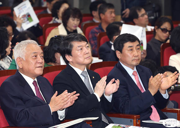 6일 오후, 국회 의원회관에서 열린 민주당 이종걸 의원, 정의당 심상정 의원, 무소속 안철수 의원이 공동 주최한 '동양사태 어떻게 할 것인가' 정책토론회에서 민주당 김한길 대표, 안 의원, 이 의원이 박수를 치고 있다.