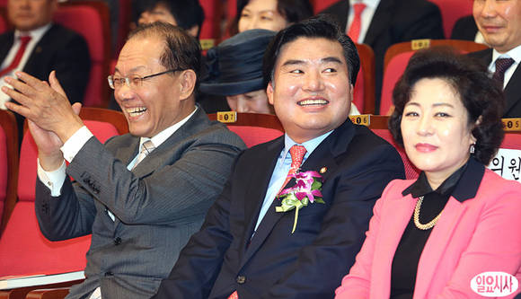 6일 오후, 국회 의원회관 대회의실에서 새누리당 원유철 의원이 '나는 오늘도 도전을 꿈꾼다' 출판기념회을 갖고 있는 가운데 황우여 새누리당 대표가 활짝 웃고 있다.