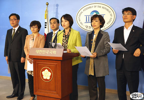 7일 오후, 유은혜 김기식 박홍근 등 민주당 초선 의원들이 국회 정론관에서 새누리당 김무성 권영세 의원의 검찰소환 조사를 촉구하는 기자회견을 열고 있다.