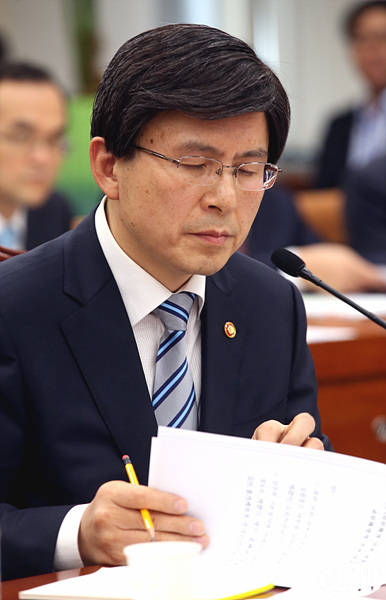 황교안 법무부 장관이 7일, 국회에서 2012 회계연도 결산 등의 안건으로 개의된 국회 법제사법위원회 전체회의에 출석해 답변자료를 확인하고 있다.