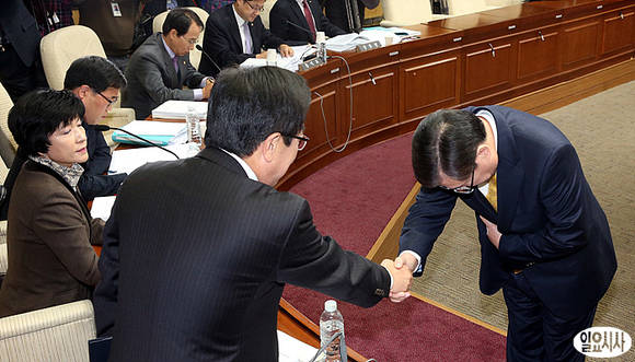 황찬현 감사원장 후보자가 11일, 서울 여의도 국회에서 열린 인사청문회 직전, 서병수 인사특위 위원장과 깎듯이 악수하고 있다.