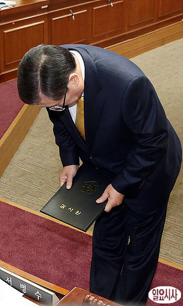 황찬현 감사원장 후보자가 11일, 서울 여의도 국회에서 열린 인사청문회 직전, 서병수 인사특위 위원장을 향해 허리숙여 인사를 하고 있다.