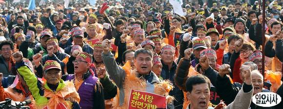 전국농민회총연맹 회원 및 농민들이 22일 오후 서울역 광장에서 '쌀 목표 가격 23만원 보장 및 한중 FTA 저지촉구 집회'를 열고 구호를 외치고 있다.