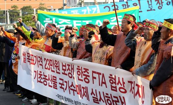 전국농민회총연맹 회원 및 농민들이 22일 오후 서울역 광장에서 '쌀 목표 가격 23만원 보장 및 한중 FTA 저지촉구 집회'를 열고 구호를 외치고 있다.