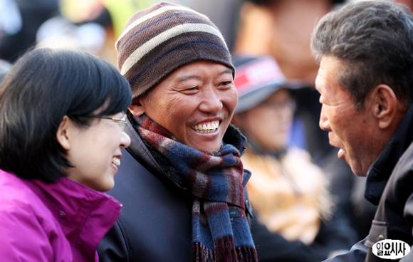 22일 오후 서울광장에서 열린 전국농민대회에서 통합진보당 이정희 대표와 김선동 의원(가운데)이 농민들이 이야기를 나누고 있다.
