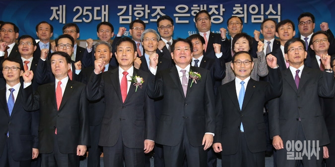 21일 서울 명동 외환은행 본점 대강당에서 열린 제25대 김한조 외환은행장 취임식에서 김 신임 은행장(앞줄 오른쪽에서 세번째), 김정태 하나금융지주 회장(네번째)을 비롯한 임직원들이 파이팅을 외치고 있다.