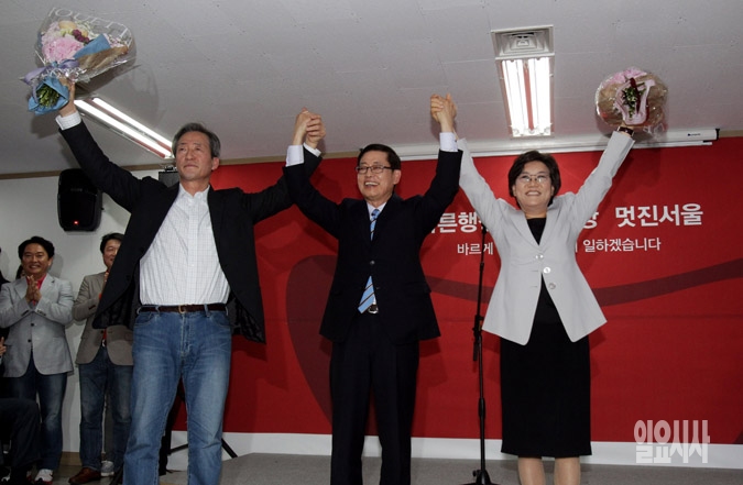 새누리당 서울시장 예비후보인 김황식 전 국무총리(가운데)가 24일 서울 여의도 대하빌딩에서 열린 자신의 선거사무소 개소식에서 정몽준(왼쪽), 이혜훈 예비후보와 함께 기념촬영을 하고 있다.
