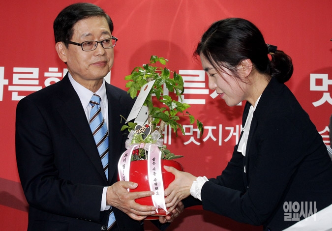 새누리당 서울시장 예비후보인 김황식 전 국무총리가 24일 서울 여의도 대하빌딩에서 열린 자신의 선거사무소 개소식에서 시민대표에게 승리기원나무를 받고 있다.