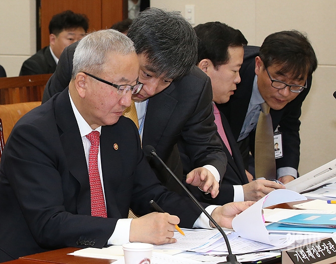 24일, 현오석 경제부총리 겸 기획재정부 장관이 국회에서 열린 창조경제활성화 특별위원회 전체회의 도중 관계자로부터 보고받고 있다.