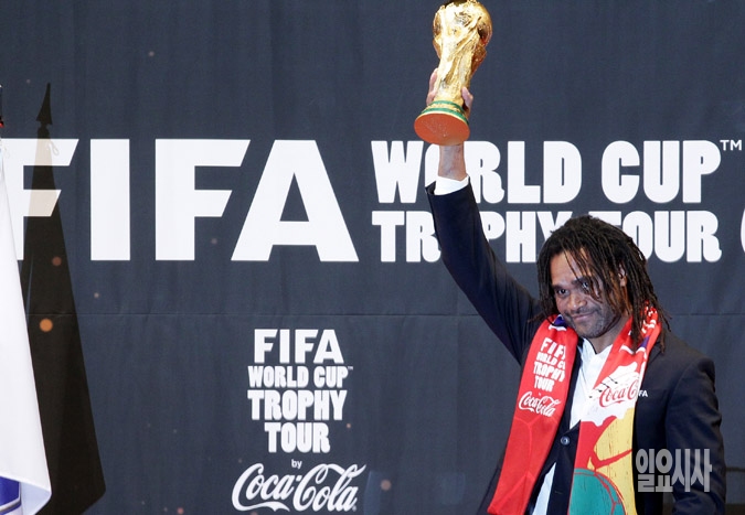 4일 서울 소공동 웨스틴조선호텔에서 코카콜라 주최로 열린 FIFA 월드컵 트로피 투어 방한 행사에서 FIFA 홍보 대사인 전 프랑스 축구 국가 대표 크리스티앙 카랑뵈가 트로피를 들어보이고 있다.