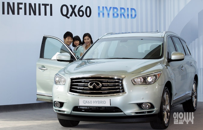 인피니티가 7일 서울 서초동 인피니티 서초 전시장에서 7인승 럭셔리 크로스오버 '인피니티 QX60 하이브리드'를 선보이고 있다. 국내 최초 7인승 하이브리드 모델인 QX60은 기존 가솔린 모델(2013년형) 대비 30% 이상 향상된 복합연비, 최상의 안락함을 제공하는 넉넉한 실내 공간, 부드러운 주행성능과 정숙성 등 다양한 매력을 제공하며 더불어, 2.5리터 QR25 수퍼 차저 엔진(233ps) 및 15kw(20ps) 전기모터를 조합해 최고출력 253ps의 강력한 성능을 자랑한다.