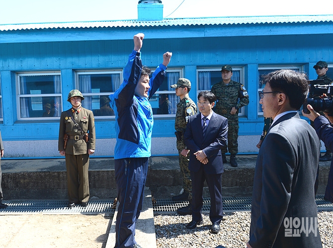 지난 4일, 남해 공해상에서 침몰한 화물선에 타고 있던 북한 선원 가운데 구조된 선원이 전날(6일), 판문점을 통해 북한으로 송환되고 있다. (사진공동취재단)