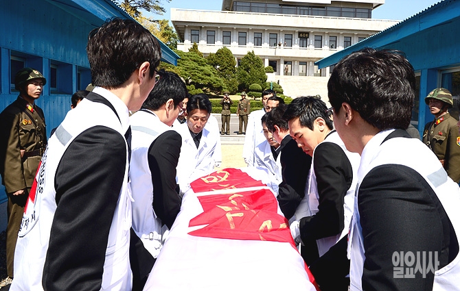 지난 4일, 남해 공해상 화물선 침몰 사고의 선원 시신이 전날(6일), 판문점을 통해 북한으로 송환되고 있다. (사진공동취재단)