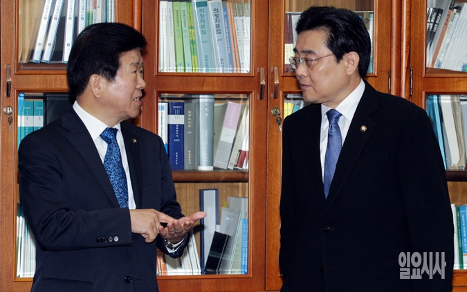 전병헌 새정치민주연합 원내대표(오른쪽)가 8일 서울 여의도 국회에서 열린 원내대책회의에서 박병석 국회부의장과 이야기를 나누고 있다.