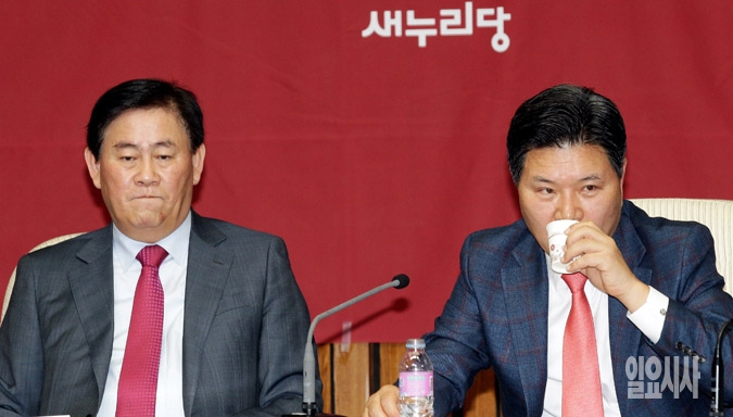 8일 서울 여의도 국회에서 열린 새누리당 원내대책회의에서 최경환 원내대표(왼쪽)와 홍문종 사무총장이 심각한 표정을 짓고 있다.