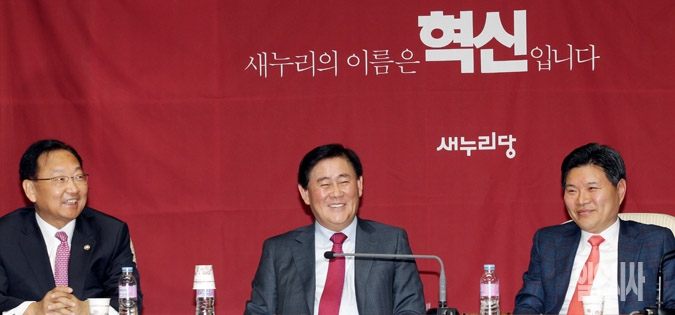 8일 서울 여의도 국회에서 열린 새누리당 원내대책회의에서 최경환 원내대표를 비롯한 참석자들이 동료의원들의 발언에 미소를 짓고 있다. 사진 왼쪽부터 유일호 정책위의장, 최 원내대표, 홍문종 사무총장.