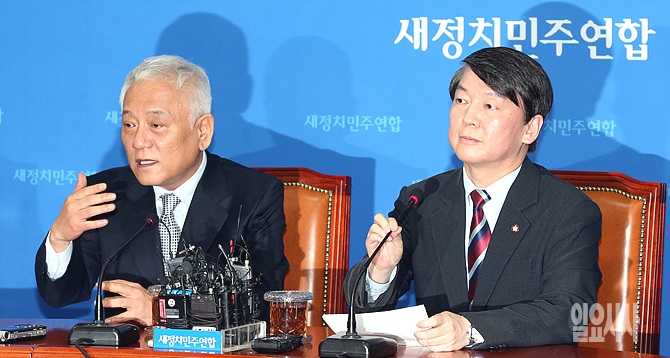 새정치민주연합 김한길 공동대표(사진 왼쪽)가 8일 오전, 서울 여의도 국회 기초공천관련 관련 기자회견 도중 안철수 공동대표의 발언을 거들고 있다.