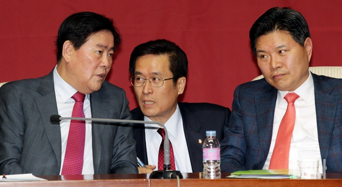 8일 서울 여의도 국회에서 열린 새누리당 원내대책회의에서 최경환 원내대표(왼쪽부터), 함진규 대변인, 홍문종 사무총장이 대화를 나누고 있다.