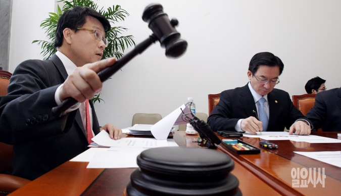 국회 운영위제도개선소위 위원장인 윤상현 새누리당 원내수석부대표가 8일 서울 여의도 국회에서 열린 운영위 소위 회의에서 의사봉을 두드리며 개회를 선언하고 있다.