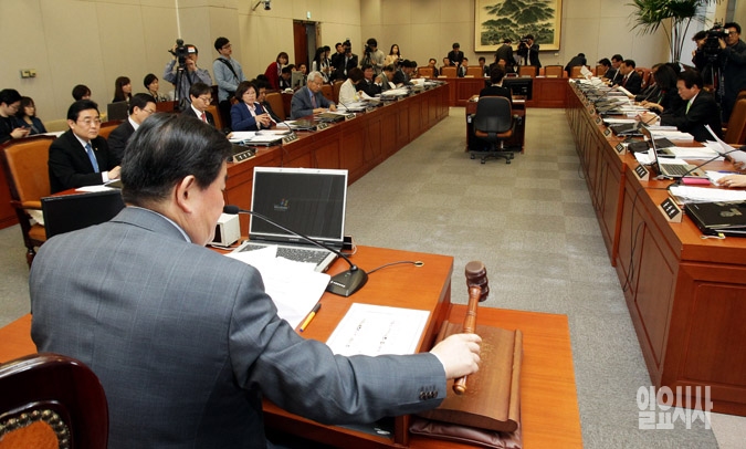 최경환 국회 운영위원장이 8일 서울 여의도 국회에서 열린 운영위 전체회의에서 의안을 상정하고 있다. 이날 국회 운영위는 국회의원 배지와 국회기 문양을 한글화하는 내용의 '국회기 및 국회배지 등에 관한 규칙 일부개정규칙안'을 통과시켰다.