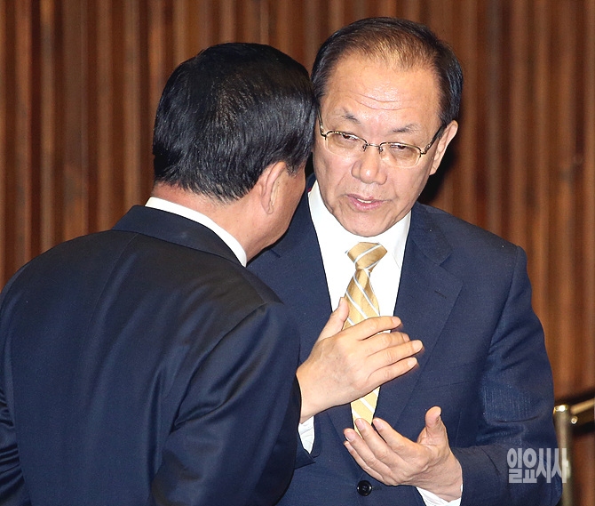 8일, 서울 여의도 국회 본회의장에서 교육·사회·문화 분야 대정부질문 직후, 새누리당 황우여 대표와 서청원 의원이 이야기를 나누고 있다.