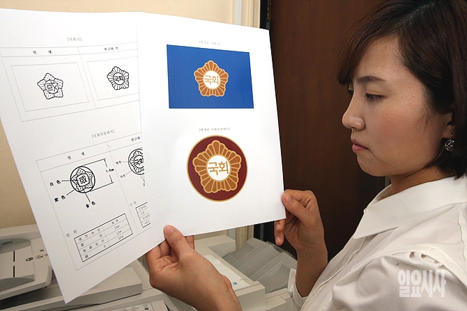 8일, 서울 여의도 국회에서 한 국회 사무처 관계자가 새로 디자인된 한글 국회의원 배지 시안을 들어보이고 있다.