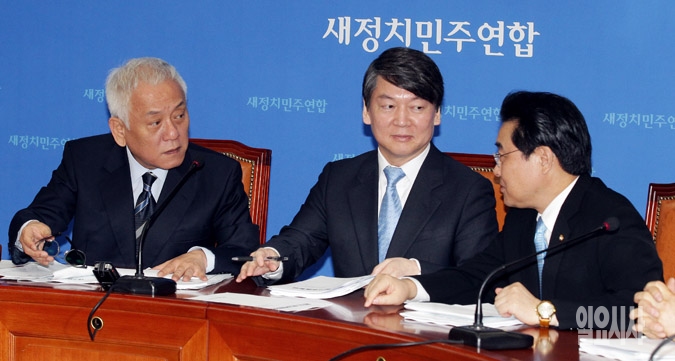 9일 서울 여의도 국회에서 열린 새정치민주연합 최고위원회의에서 김한길(왼쪽부터), 안철수 공동대표와 전병헌 원내대표가 이야기를 나누고 있다.