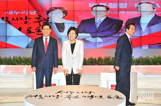 9일 오후, 서울 여의도 MBC 사옥에서 새누리당 김황식·이혜훈·정몽준(사진 왼쪽부터) 6·4지방선거 서울시장 후보들이 TV토론회 직전, 기념촬영을 한 가운데, 정 후보만 먼저 자리로 이동하고 있다.