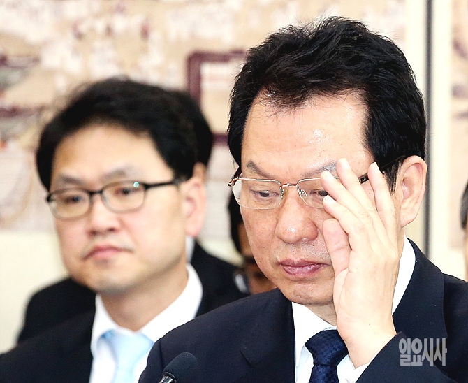 서남수 교육부 장관이 9일, 서울 여의도 국회 교육문화체육관광위원회 전체회의 도중, 안경을 만지고 있다.