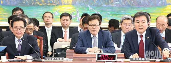 신제윤 금융위원장(사진 오른쪽)이 9일, 서울 여의도 국회에서 열린 정무위원회 전체회의에 출석해 의원들의 질의에 답변하고 있다.