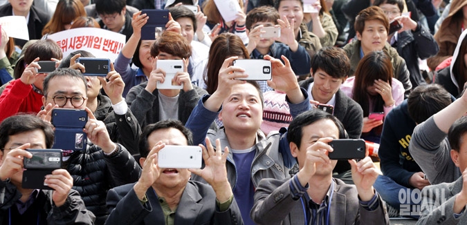 전국이동통신유통협회 회원들이 9일 서울역 앞 광장에서 '영업정지 중단 및 피해보상 촉구 결의대회'를 열고 방통위 시장개입 반대, 중소기업 적합업종 지정 등을 촉구하는 구호를 외치고 있다.