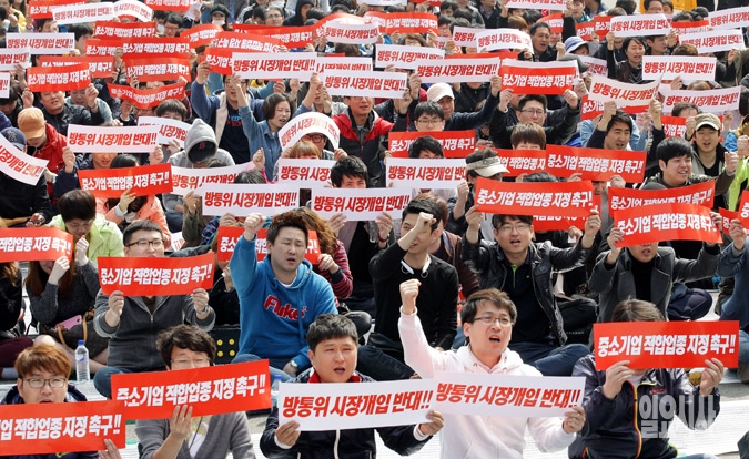 전국이동통신유통협회 회원들이 9일 서울역 앞 광장에서 '영업정지 중단 및 피해보상 촉구 결의대회'를 열고 방통위 시장개입 반대, 중소기업 적합업종 지정 등을 촉구하는 구호를 외치고 있다.