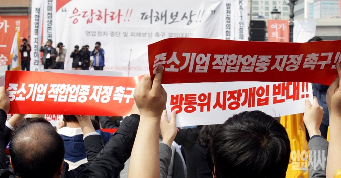 전국이동통신유통협회 회원들이 9일 서울역 앞 광장에서 '영업정지 중단 및 피해보상 촉구 결의대회'를 열고 방통위 시장개입 반대, 중소기업 적합업종 지정 등을 촉구하는 구호를 외치고 있다.