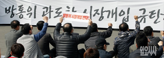 전국이동통신유통협회 회원들이 9일 서울역 앞 광장에서 '영업정지 중단 및 피해보상 촉구 결의대회'를 열고 방통위 시장개입 반대, 중소기업 적합업종 지정 등을 촉구하는 구호를 외치고 있다.
