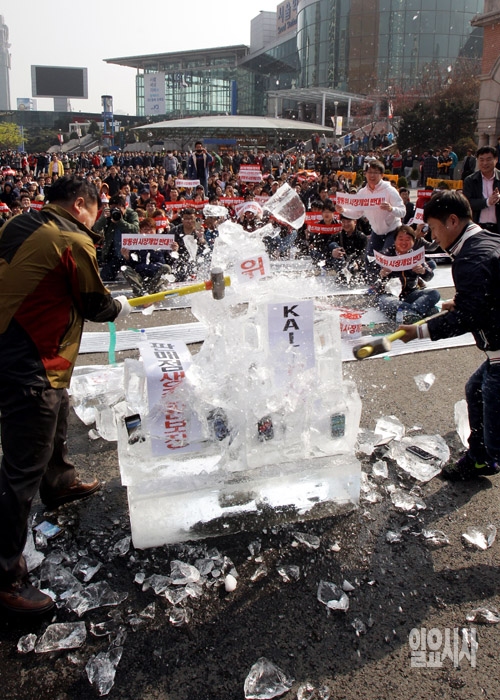 전국이동통신유통협회 회원들이 9일 서울역 앞 광장에서 열린 '영업정지 중단 및 피해보상 촉구 결의대회'에서 휴대전화 모형을 넣은 얼음을 깨는 퍼포먼스를 펼치고 있다.