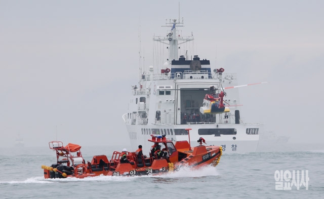 여객선 '세월호' 침몰 삼일째인 18일 전남 진도군 관매도 사고 해역에서 해경 헬기가 수색을 마치고 복귀하고 있다.