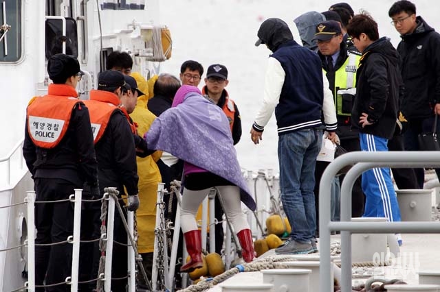 여객선 '세월호' 침몰 나흘째인 19일 전남 진도군 팽목항에서 실종자 가족들이 사고 해역으로 떠나기 위해 해양경철청 배를 타고 있다.