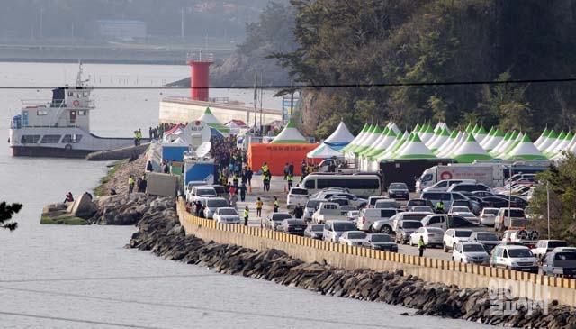 여객선 '세월호' 침몰 나흘째인 19일 전남 진도군 팽목항이 구조 소식을 기다리는 실종자 가족을 비롯한 자원봉사자들로 붐비고 있다.