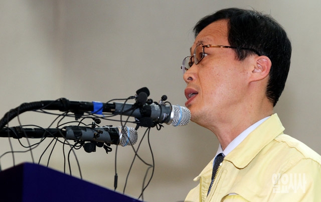 여객선 '세월호' 침몰 나흘째인 19일 전남 진도군청에서 박승기 해양수산부 대변인이 범정부 사고대책본부 상황점검회의 결과를 발표하고 있다.
