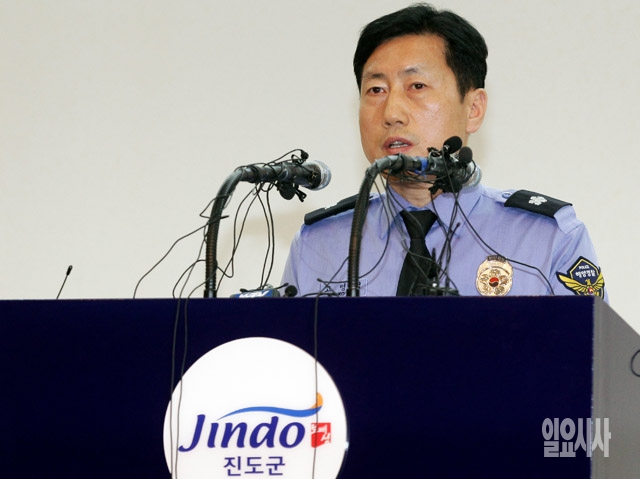 여객선 '세월호' 침몰 나흘째인 19일 전남 진도군청에서 고명석 해양경찰청 장비기술국장이 현장수색 및 구조상황을 설명하고 있다.