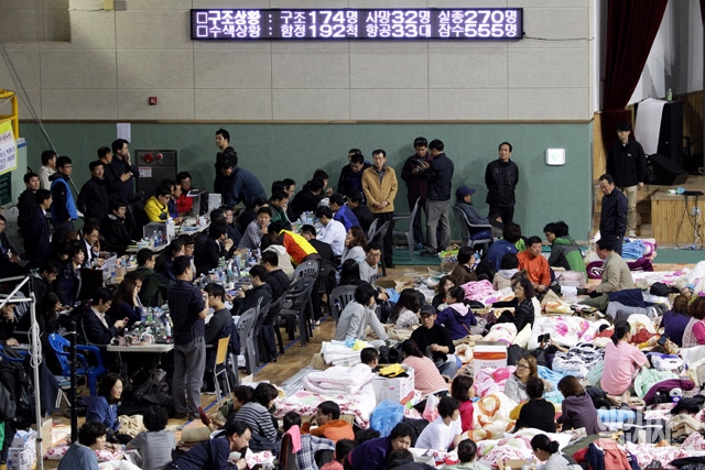 여객선 '세월호' 침몰 나흘째인 19일 전남 진도실내체육관에 구조·수색상황이 표시된 전광판이 설치되어 있다.