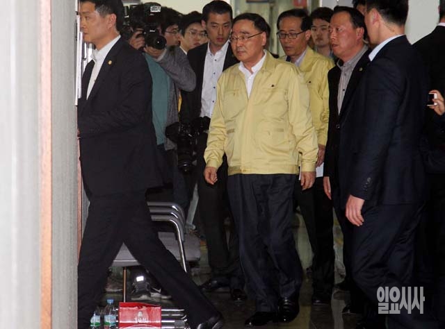 정홍원 국무총리가 20일 전남 진도군청에서 열린 특별재난구역 선포 등을 논의하기 위한 관계장관회의에 참석하고 있다.