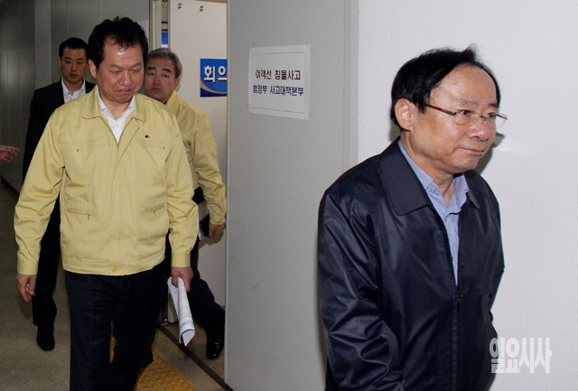 이주영 해양수산부 장관(오른쪽부터), 서남수 교육부 장관, 유진룡 문화체육관광부 장관이 20일 전남 진도군청에서 열린 특별재난구역 선포 등을 논의하기 위한 관계장관회의를 마친 뒤 나서고 있다.