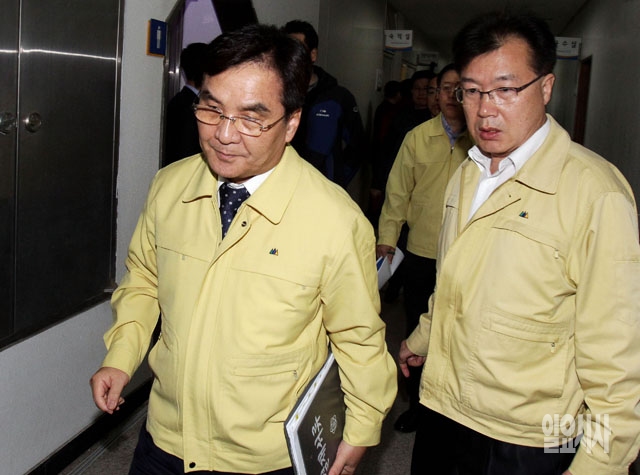 강병규 안전행정부 장관(왼쪽)이 20일 전남 진도군청에서 열린 특별재난구역 선포 등을 논의하기 위한 관계장관회의를 마친 뒤 나서고 있다.