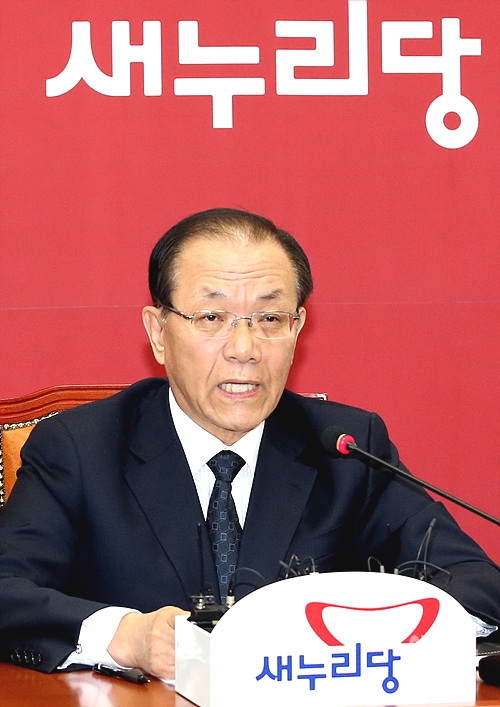 '세월호 참사'로 사회 전체적으로 분위기가 침체되어 있는 가운데 21일 오전, 서울 여의도 국회에서 열린 새누리당 최고위원회의 도중 황우여 대표가 모두발언하고 있다.