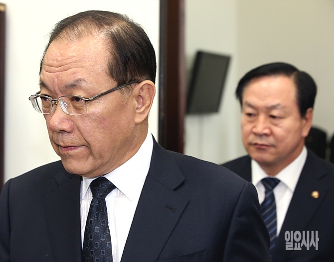 '세월호 참사'로 사회 전체적으로 분위기가 침체되어 있는 가운데 21일 오전, 서울 여의도 국회에서 열린 새누리당 최고위원회의 참석을 위해 무거운 표정으로 황우여 대표와 '4성 장군' 출신의 한기호 최고위원원이 입장하고 있다.