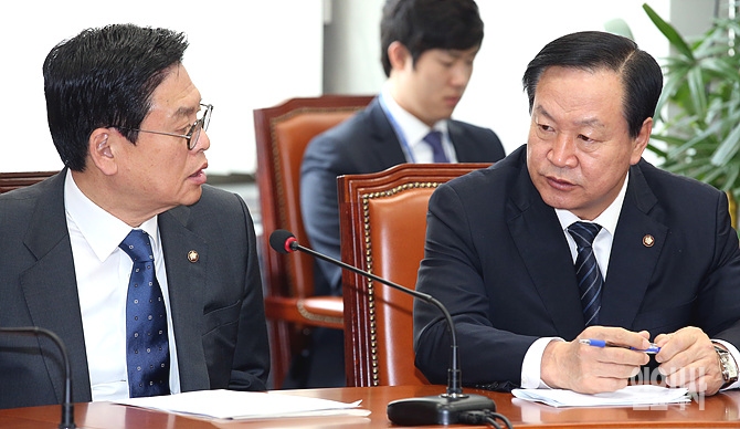 '세월호 참사'로 사회 전체적으로 분위기가 침체되어 있는 가운데 21일 오전, 서울 여의도 국회에서 열린 새누리당 최고위원회의 도중 '4성 장군' 출신의 한기호 최고위원(사진 오른쪽)과 정우택 최고위원이 이야기를 하고 있다.