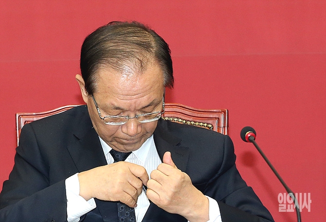 '세월호 참사'로 사회 전체적으로 분위기가 침체되어 있는 가운데 21일 오전, 서울 여의도 국회에서 열린 새누리당 최고위원회의에서 황우여 대표가 무거운 표정을 짓고 있다.